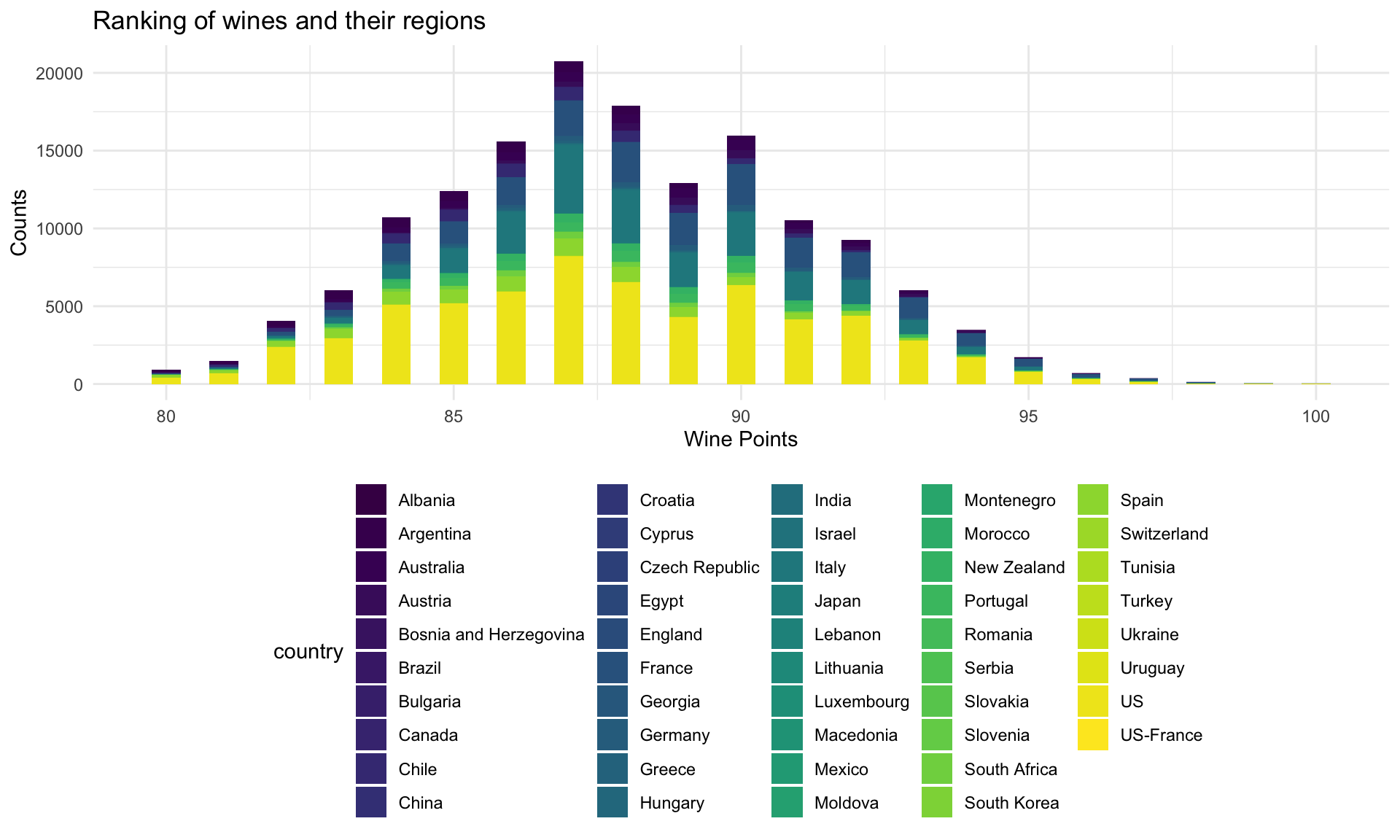 Some professional reviewers gave rankings to more than 150,000 types of wines based on their regions, prices, tastes, variety and winery. From the histogram we have plotted, we can see that the distribution of rankings of wines is close to normal distribution and the mean is around 87.8885274.