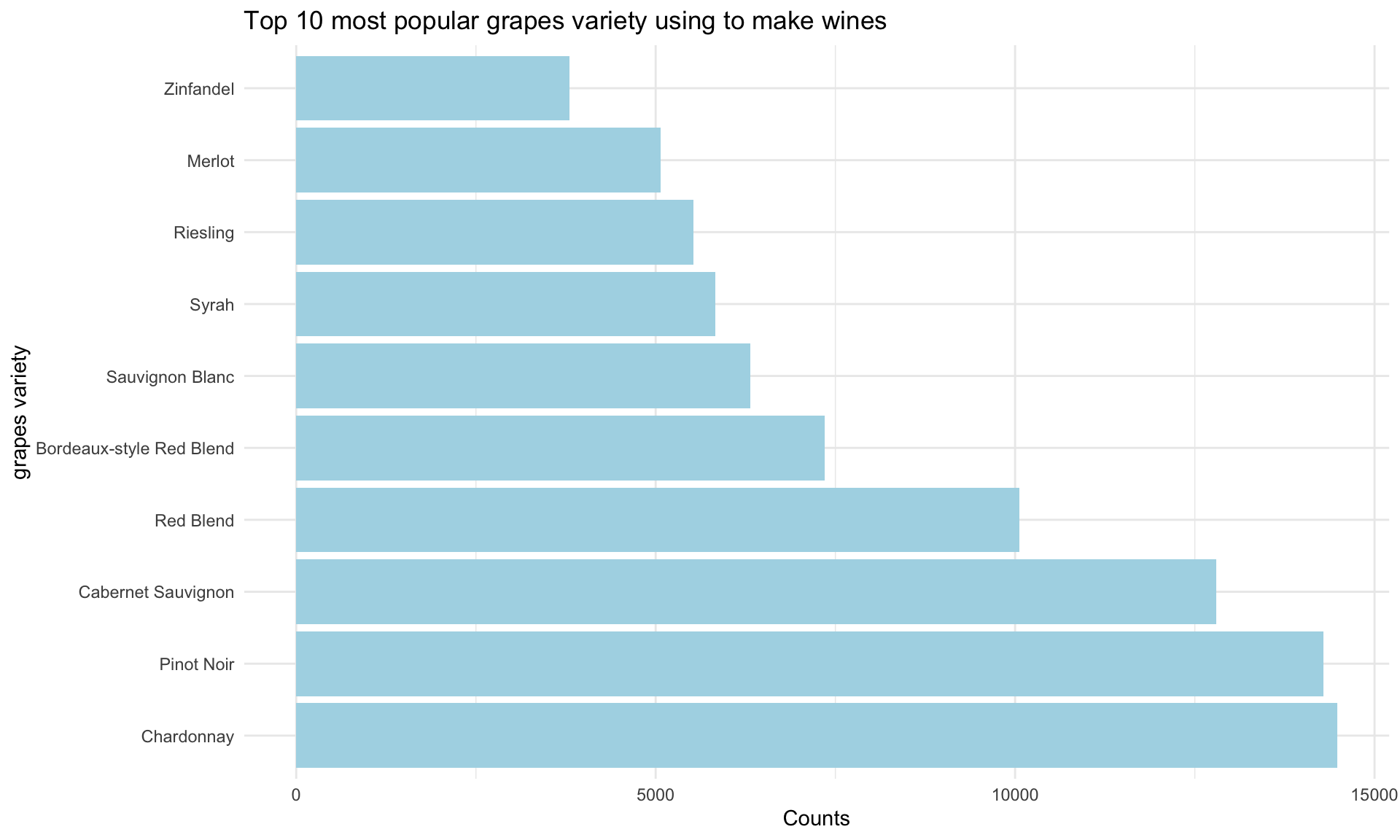 grapes = within(wine_df, variety <- factor(variety, levels = names(sort(table(variety), decreasing = TRUE)[1:10]))) %>%