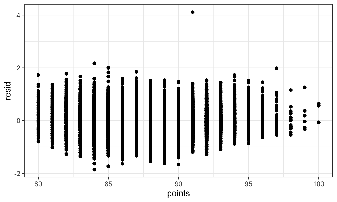 Non-random distribution of variances of residual tells us that bootstrapping needs to be down before fitting the model for Price vs. Points of wine in North America.