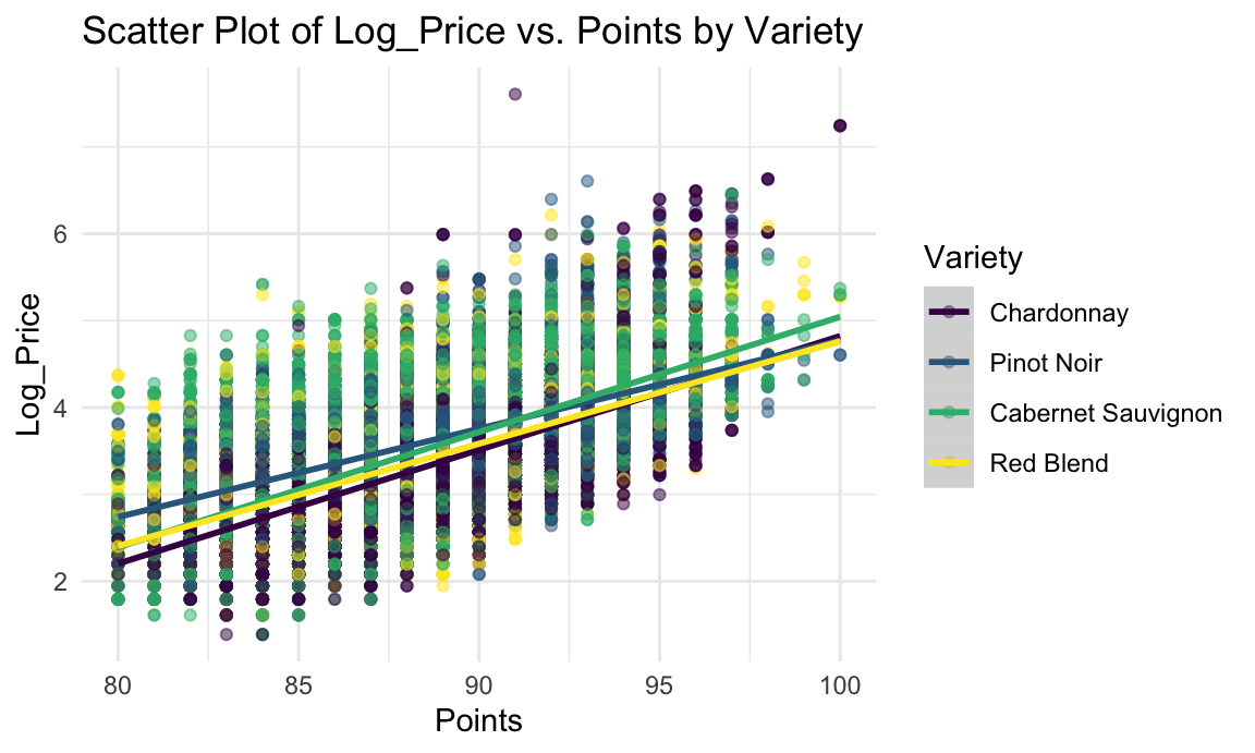 Since log(Price) and Points are numerical variables, we only need to worry about categorical predictor Variety, which includes 632 unique levels. To simplify our model, we choose to select the most representative four varieties: Chardonnay, Pinot Noir, Cabernet Sauvignon, Red Blend. Here, we define representative as having more than ten thousands counts of wines for the particular variety.